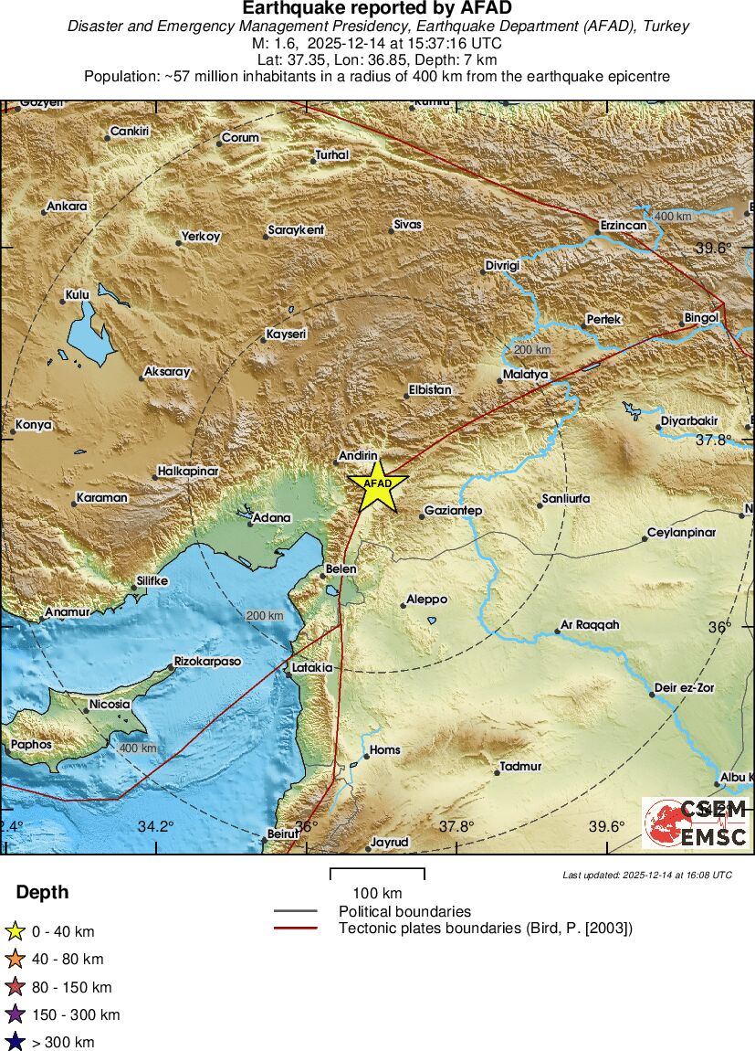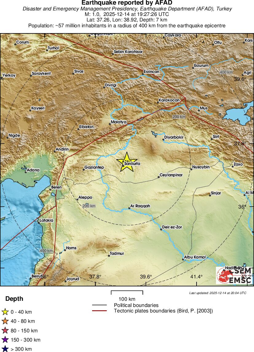 | 1.0 | 7 | 2326 | 19:27:26 | Link | Minor earthquake - EASTERN TURKEY - December 14, 2025 |