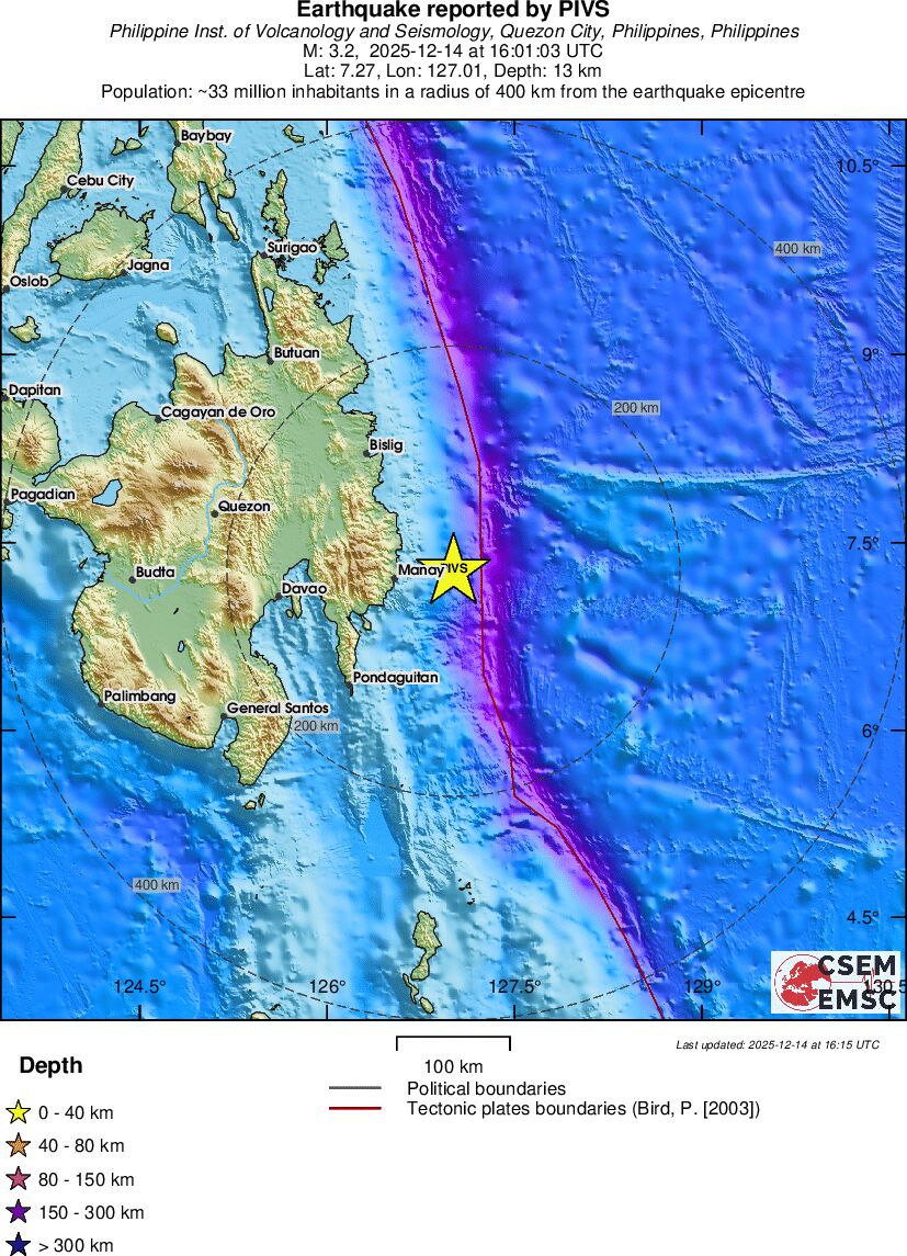 | 3.2 | 13 | 7236 | 16:01:03 | Link | Minor earthquake - PHILIPPINE ISLANDS REGION - December 14, 2025 |
