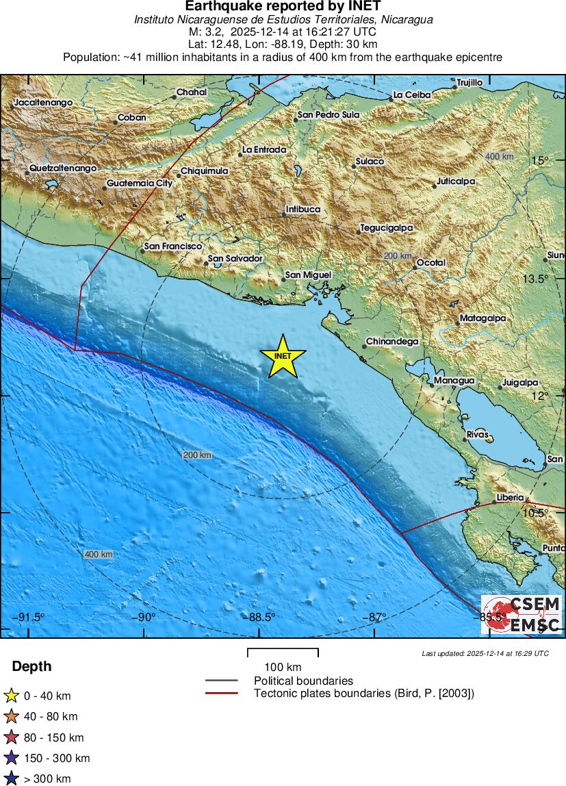 | 3.0 | 37 | 5292 | 18:54:28 | Link | Minor earthquake - NEAR COAST OF NICARAGUA - December 14, 2025 |