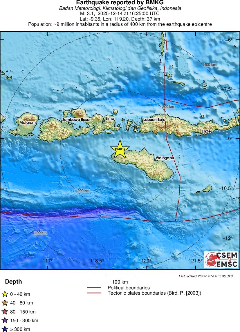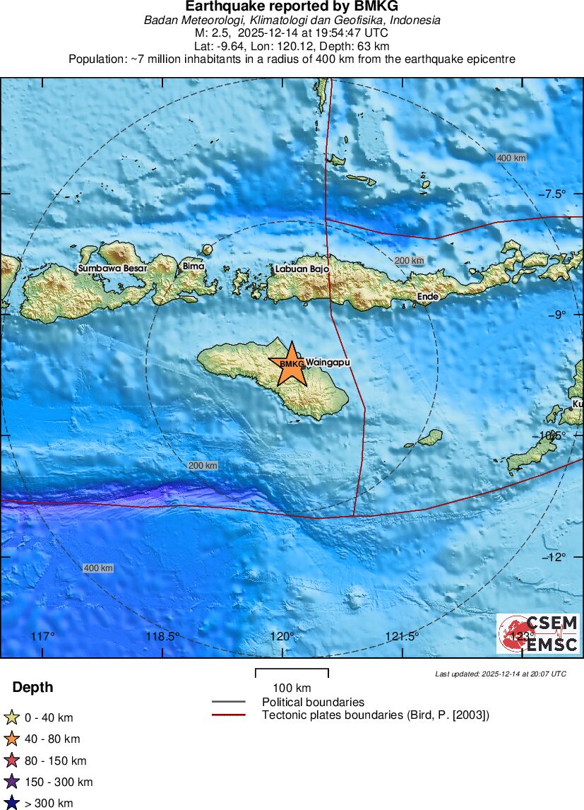| 2.6 | 218 | 7875 | 20:59:20 | Link | Minor earthquake - SUMBAWA REGION, INDONESIA - December 14, 2025 |