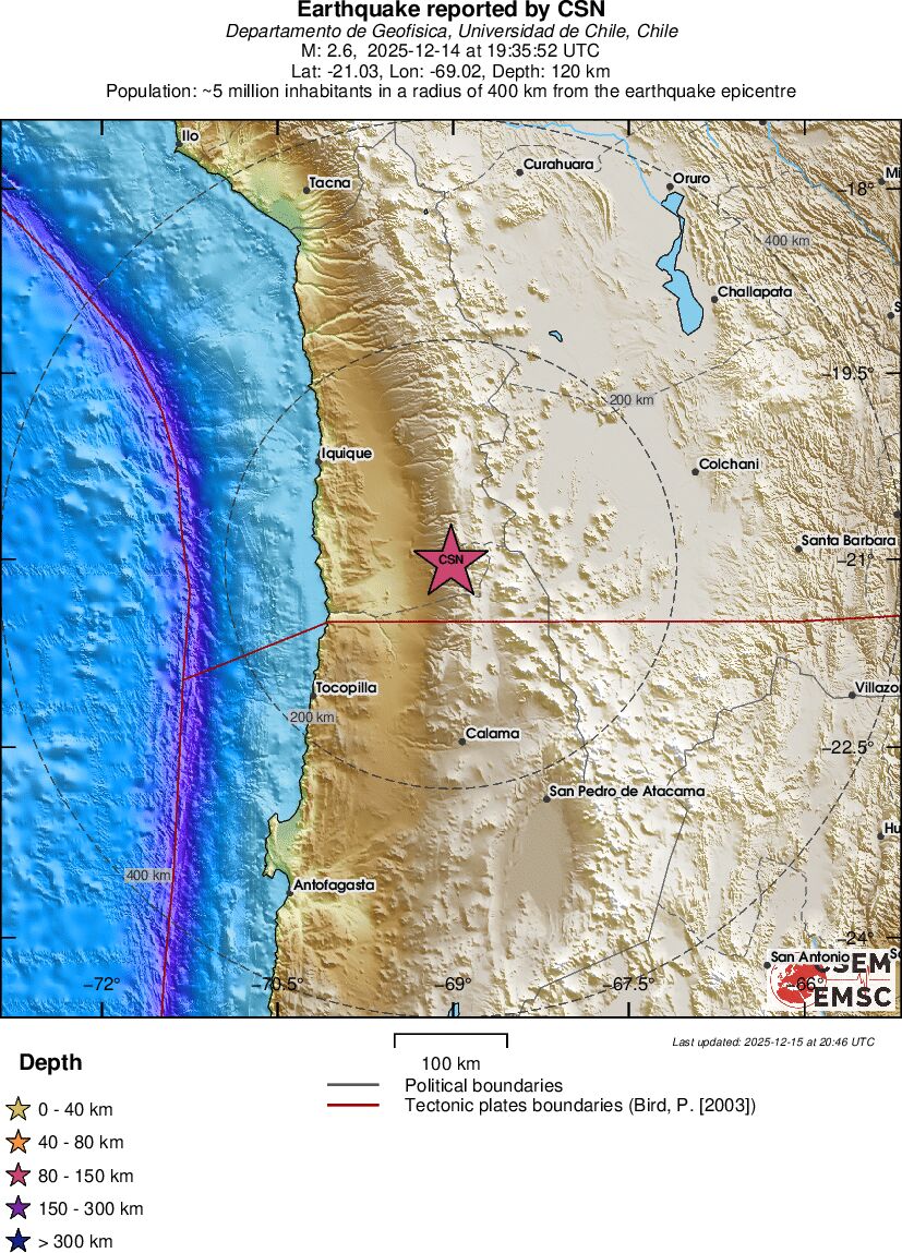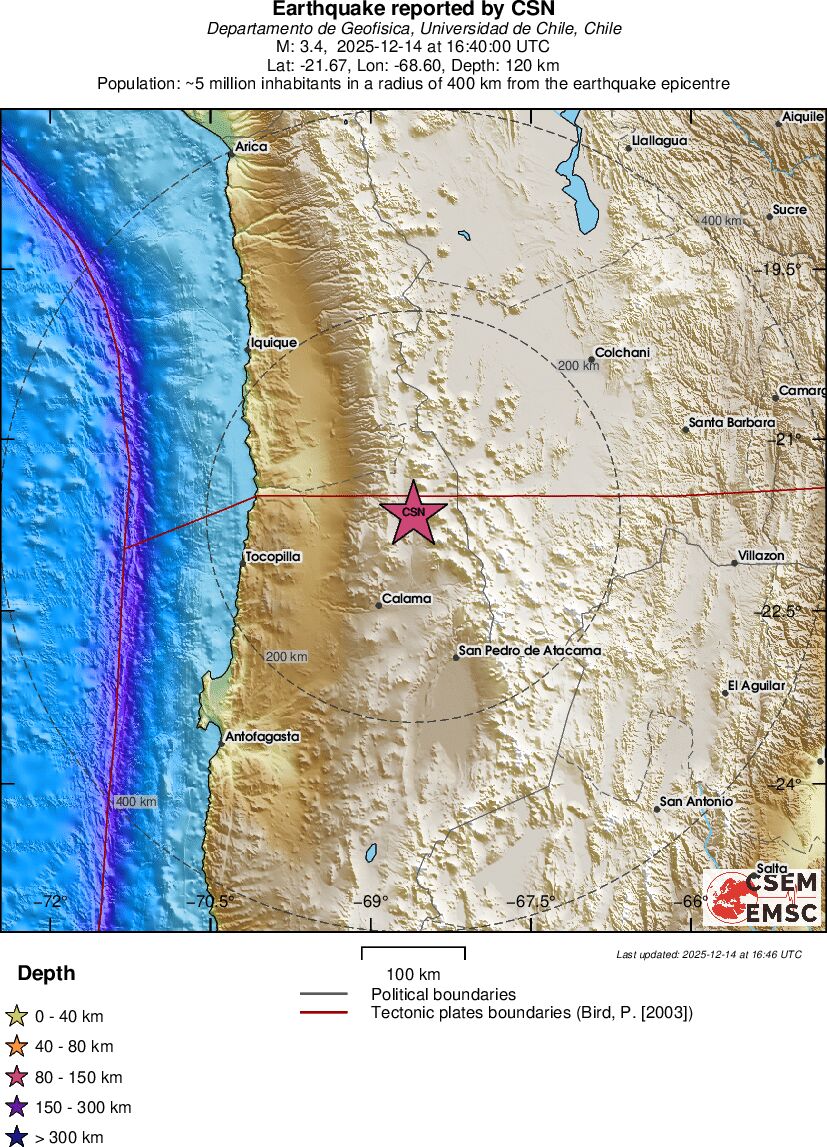 | 3.4 | 120 | 6570 | 16:40:00 | Link | Minor earthquake - ANTOFAGASTA, CHILE - December 14, 2025 |