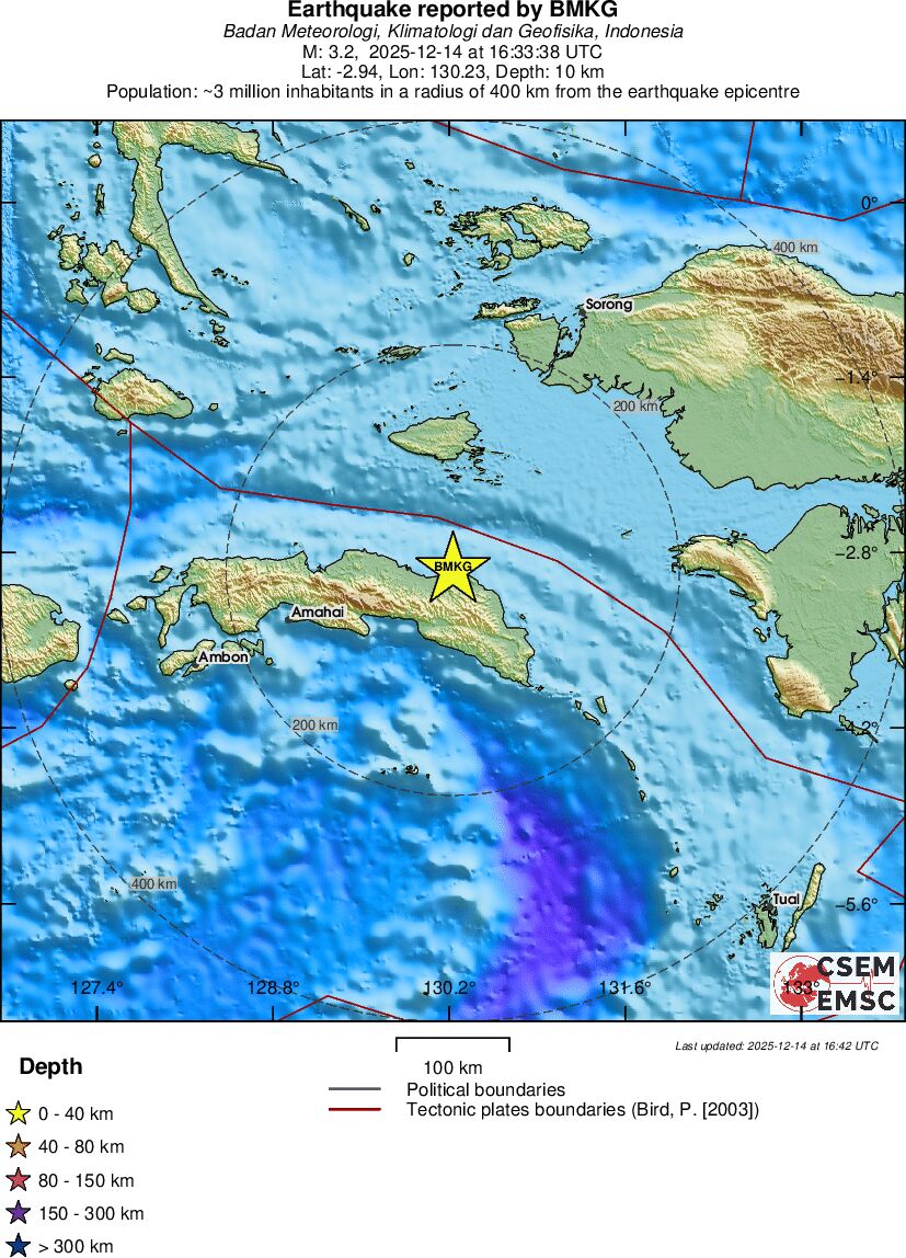 | 2.8 | 195 | 7648 | 21:00:35 | Link | Minor earthquake - MOLUCCA SEA - December 14, 2025 |