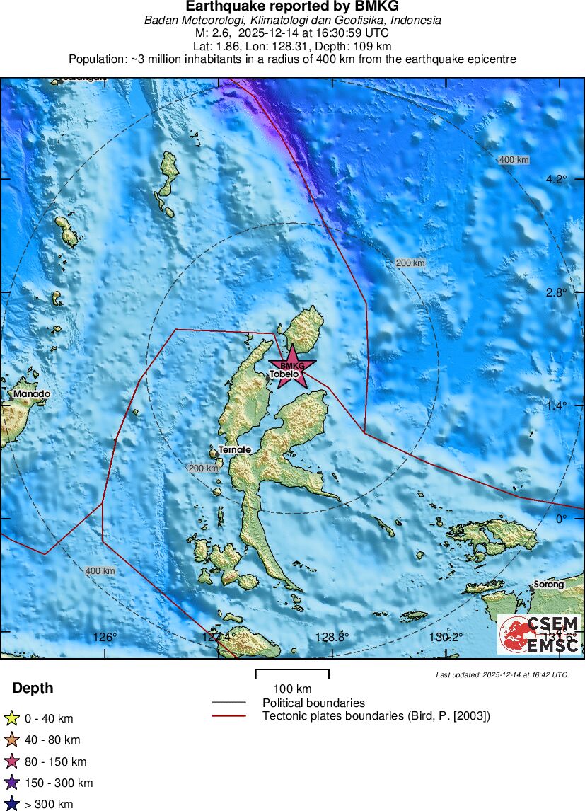 | 2.6 | 109 | 7611 | 16:30:59 | Link | Minor earthquake - HALMAHERA, INDONESIA - December 14, 2025 |