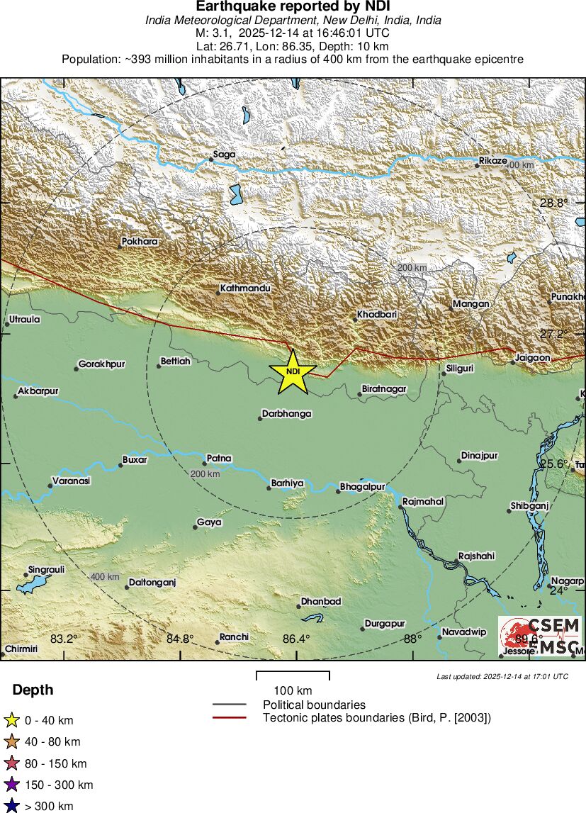 | 3.1 | 10 | 4692 | 16:46:01 | Link | Minor earthquake - NEPAL-INDIA BORDER REGION - December 14, 2025 |