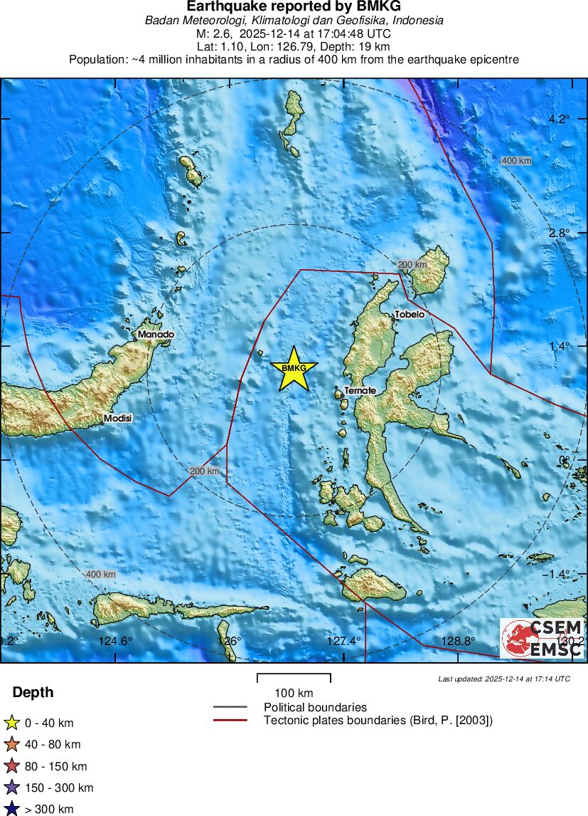 | 2.6 | 19 | 7611 | 17:04:48 | Link | Minor earthquake - MOLUCCA SEA - December 14, 2025 |