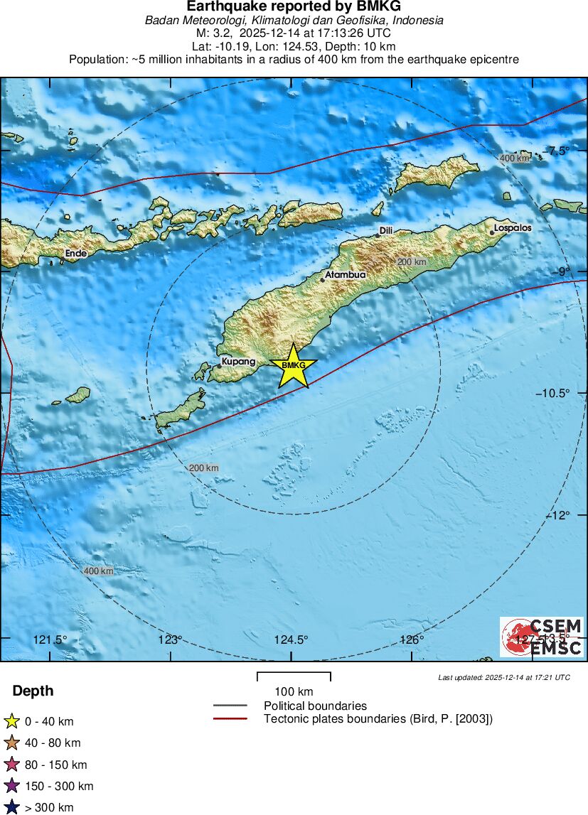 | 3.2 | 10 | 8219 | 17:13:26 | Link | Minor earthquake - TIMOR REGION, INDONESIA - December 14, 2025 |