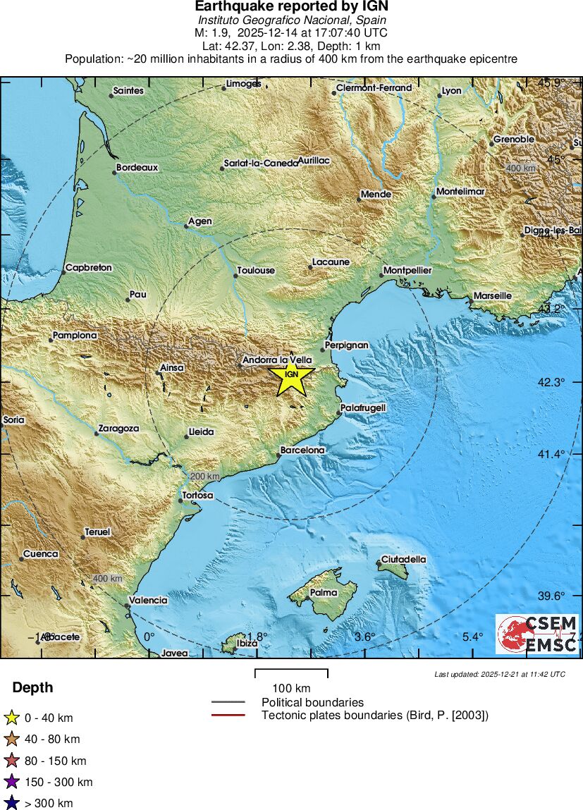 | 2.9 | 0 | 1248 | 21:18:56 | Link | Minor earthquake - SPAIN - December 14, 2025 |