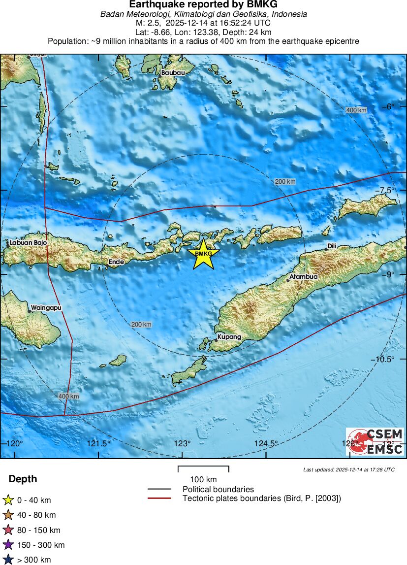 | 2.5 | 24 | 8088 | 16:52:24 | Link | Minor earthquake - FLORES REGION, INDONESIA - December 14, 2025 |