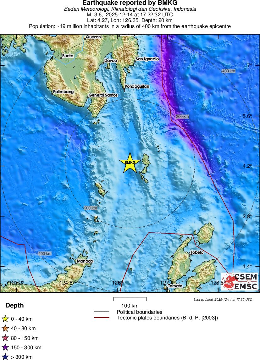 | 3.6 | 20 | 7401 | 17:22:32 | Link | Minor earthquake - KEPULAUAN TALAUD, INDONESIA - December 14, 2025 |