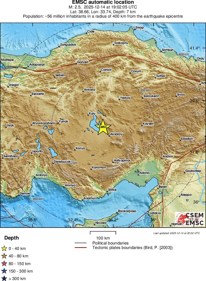 | 1.4 | 7 | 2202 | 17:40:07 | Link | Minor earthquake - CENTRAL TURKEY - December 14, 2025 |