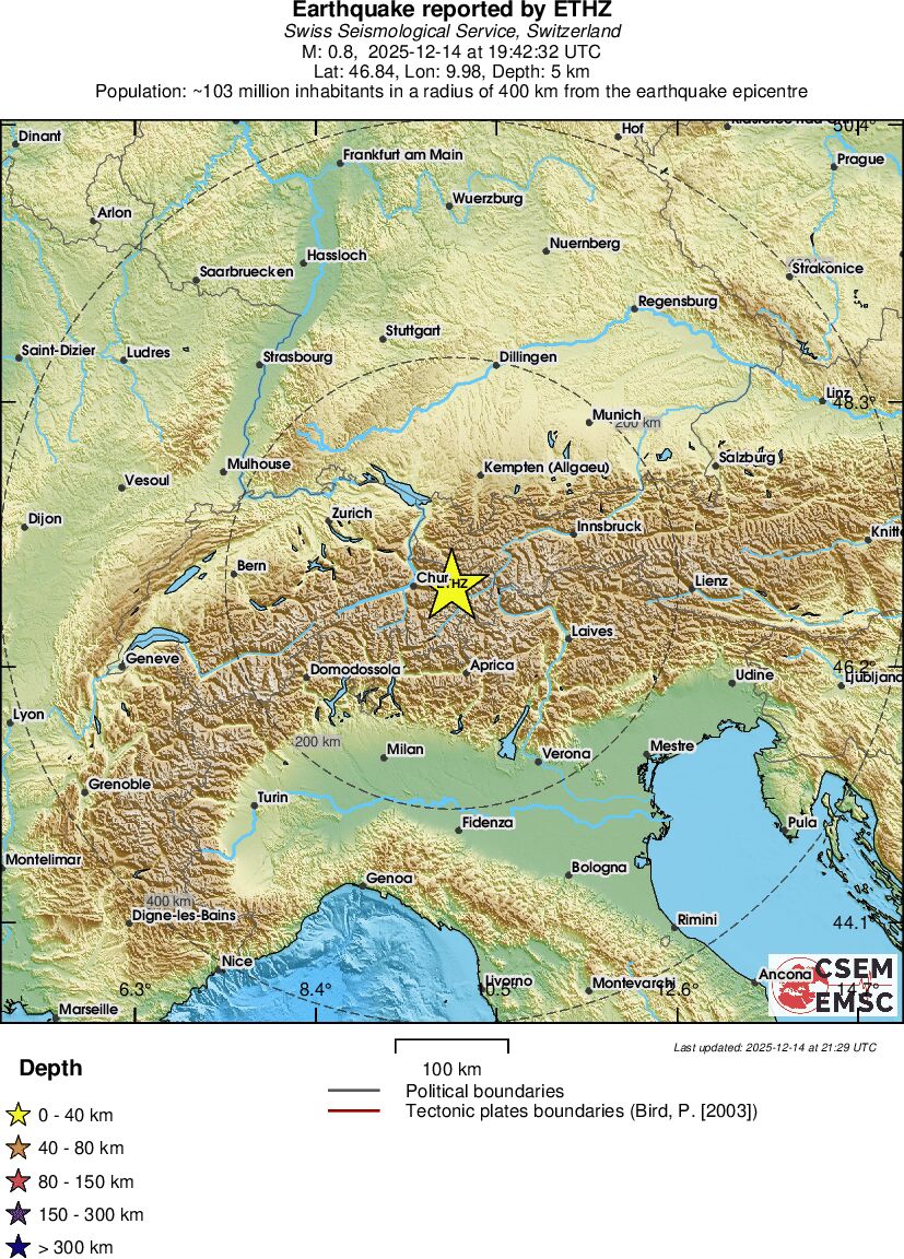| 0.8 | 5 | 843 | 19:42:32 | Link | Minor earthquake - SWITZERLAND - December 14, 2025 |