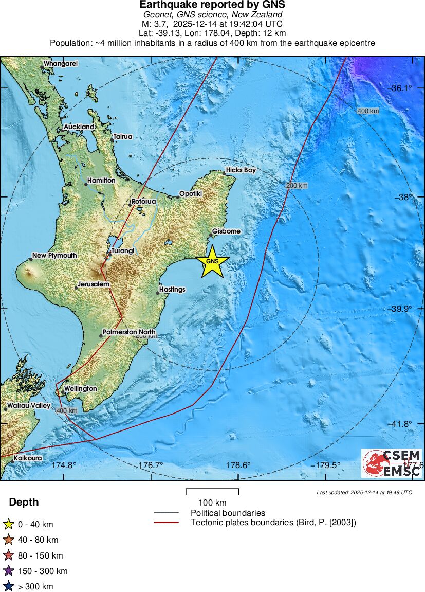 | 3.7 | 12 | 11277 | 19:42:04 | Link | Minor earthquake - OFF E. COAST OF N. ISLAND, N.Z. - December 14, 2025 |