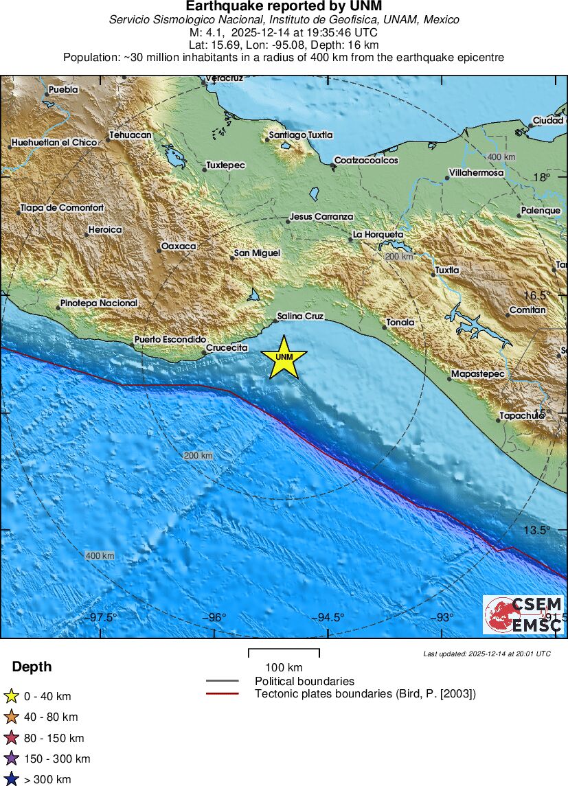 | 4.1 | 16 | 5396 | 19:35:46 | Link | Light earthquake - OFFSHORE OAXACA, MEXICO - December 14, 2025 |
