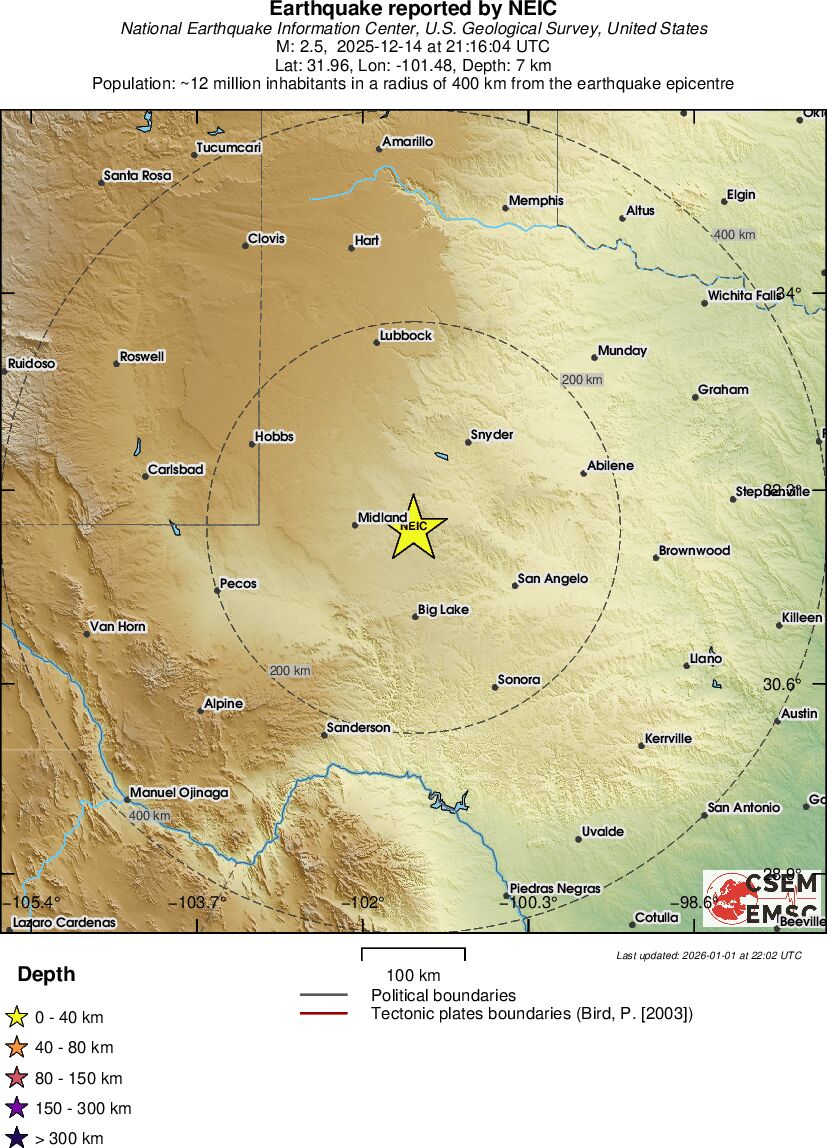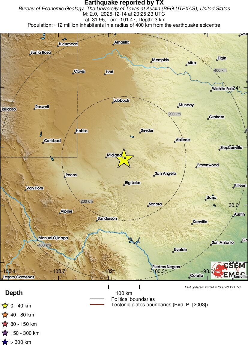 | 2.0 | 0 | 4843 | 20:20:51 | Link | Minor earthquake - WESTERN TEXAS - December 14, 2025 |