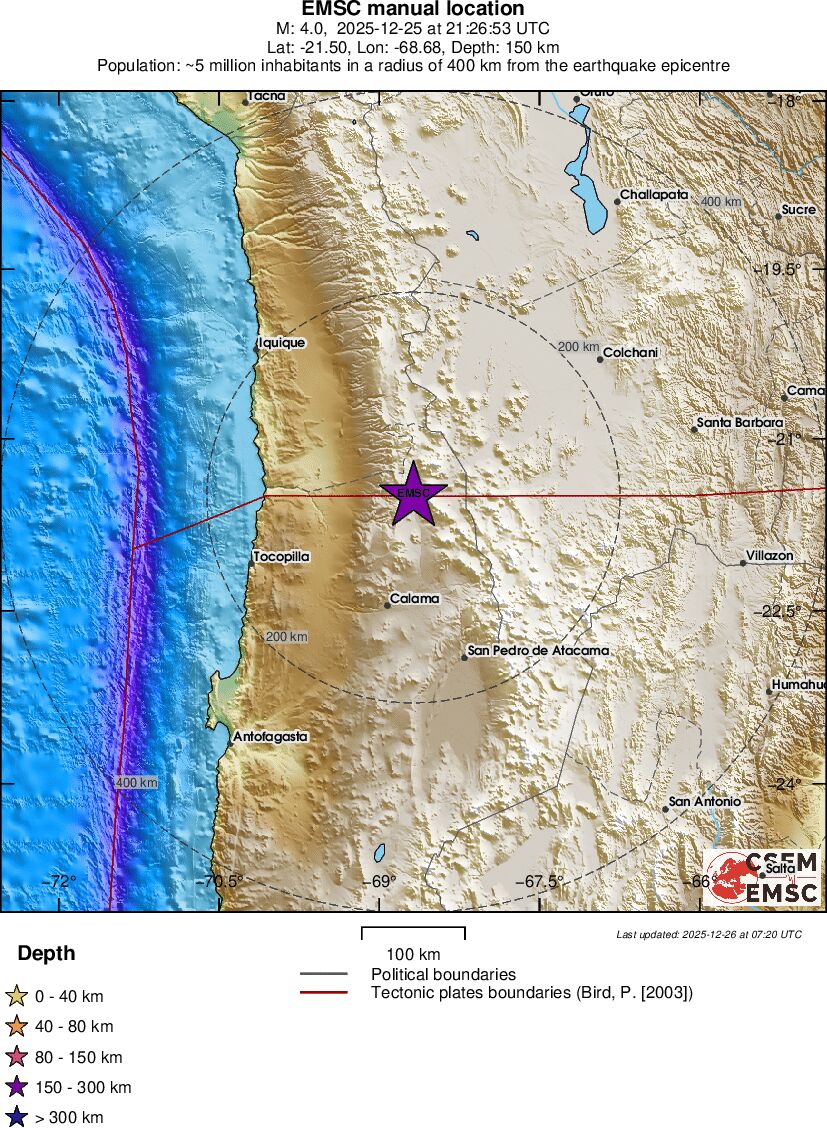 | 3.7 | 135 | 6559 | 21:26:54 | Link | Minor earthquake - ANTOFAGASTA, CHILE - December 25, 2025 |