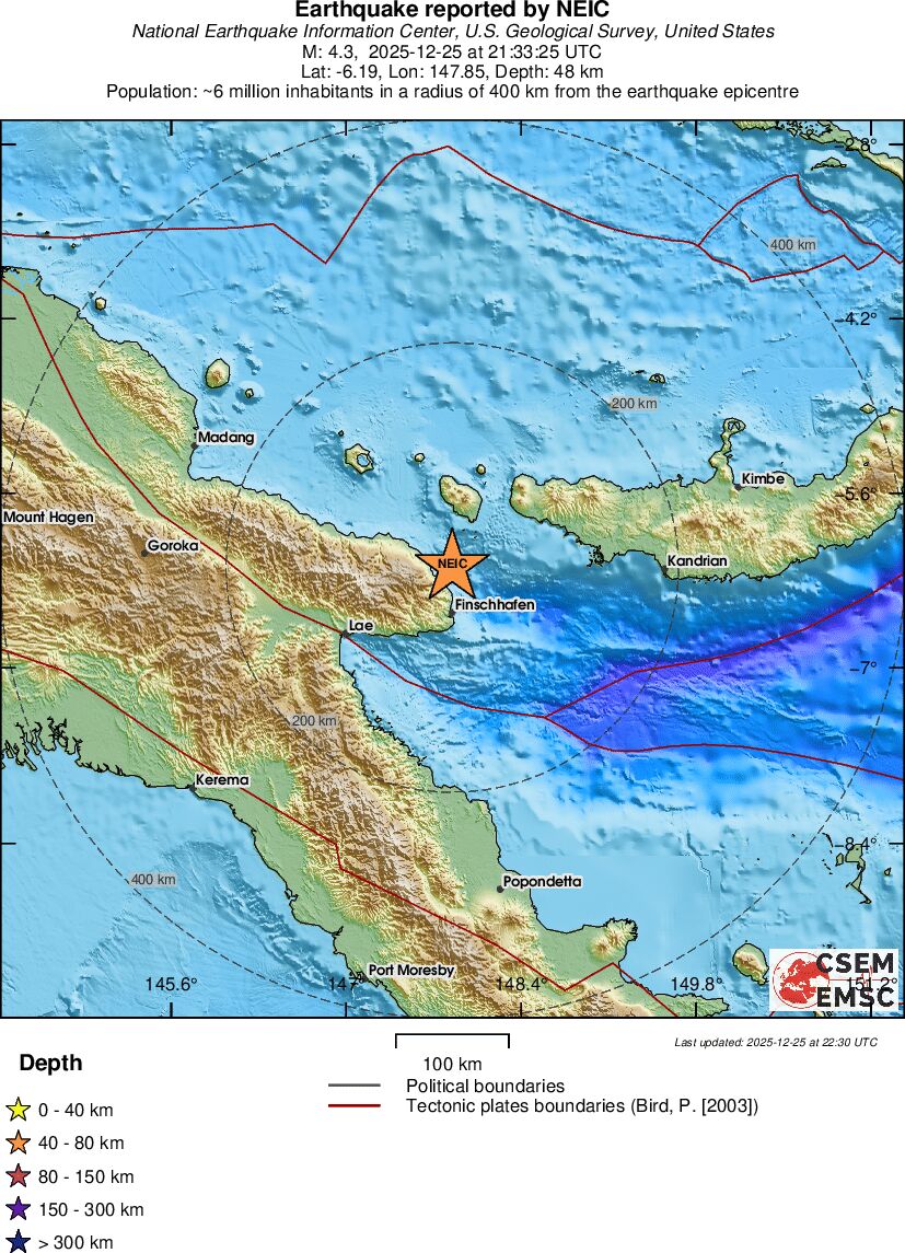 | 4.3 | 48 | 8654 | 21:33:25 | Link | Light earthquake - EASTERN NEW GUINEA REG., P.N.G. - December 25, 2025 |