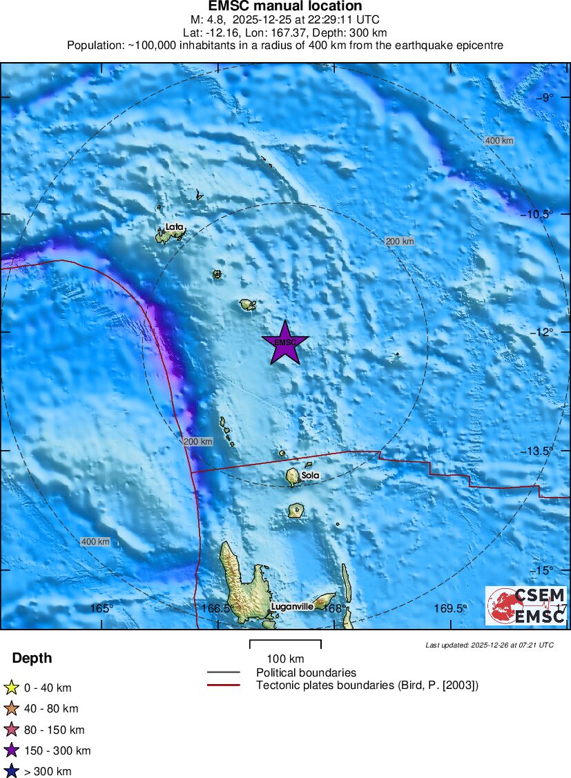 | 4.8 | 284 | 9370 | 22:29:10 | Link | Light earthquake - SANTA CRUZ ISLANDS - December 25, 2025 |