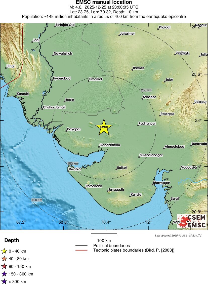 | 4.6 | 10 | 4243 | 23:00:02 | Link | Light earthquake - GUJARAT, INDIA - December 25, 2025 |