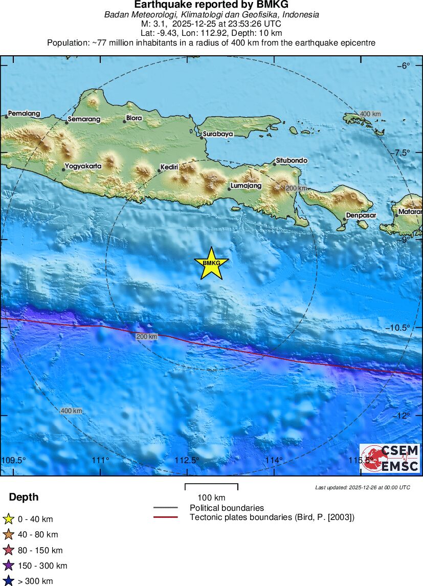 | 3.1 | 10 | 7758 | 23:53:26 | Link | Minor earthquake - SOUTH OF JAVA, INDONESIA - December 25, 2025 |