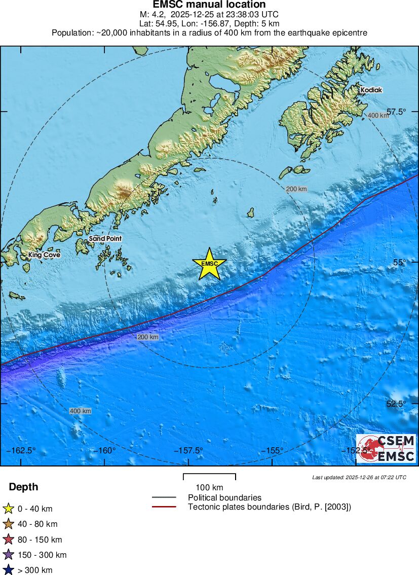 | 4.2 | 10 | 4639 | 23:38:02 | Link | Light earthquake - SOUTH OF ALASKA - December 25, 2025 |