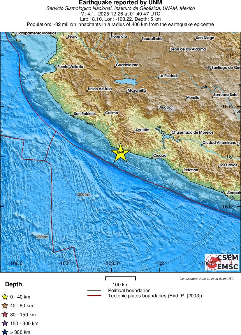 | 4.1 | 5 | 5564 | 01:40:47 | Link | Light earthquake - OFFSHORE MICHOACAN, MEXICO - December 26, 2025 |
