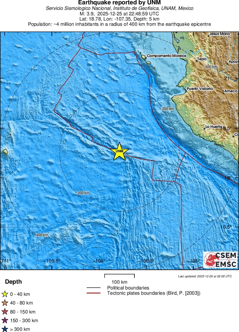| 3.9 | 5 | 5675 | 22:48:59 | Link | Minor earthquake - OFF COAST OF JALISCO, MEXICO - December 25, 2025 |