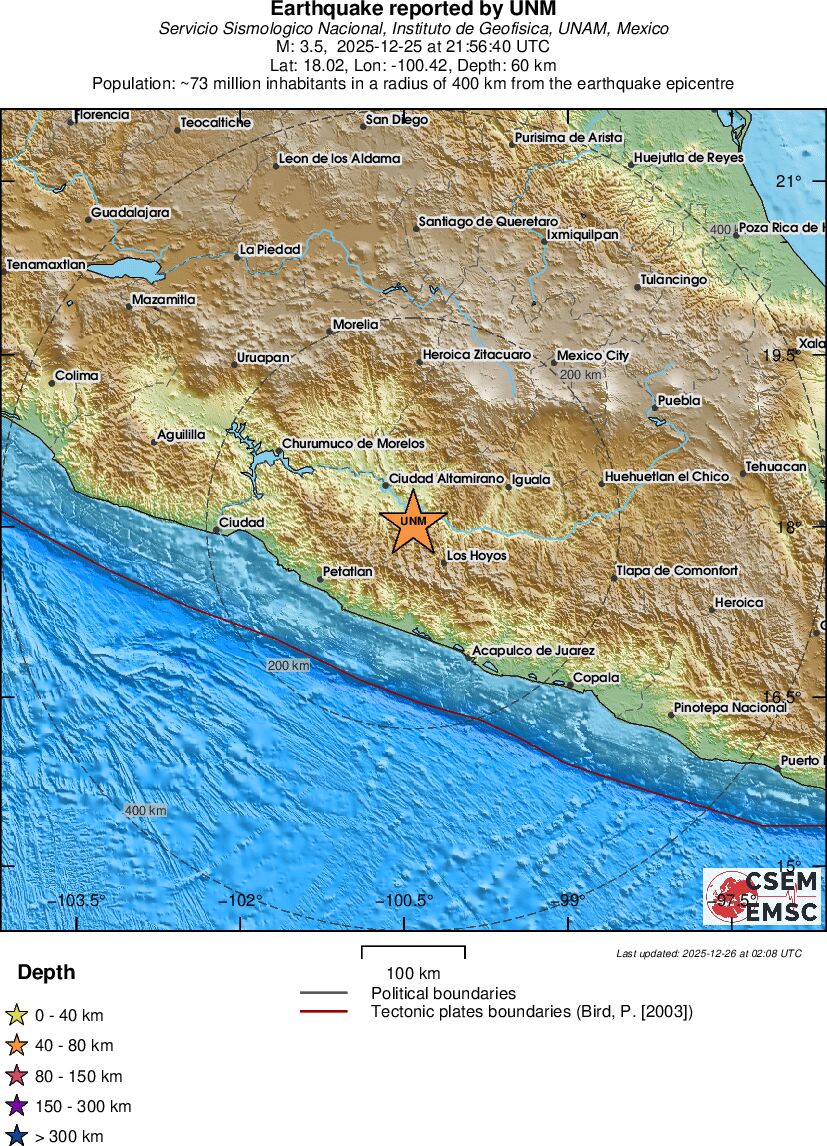 | 3.5 | 60 | 5465 | 21:56:40 | Link | Minor earthquake - GUERRERO, MEXICO - December 25, 2025 |