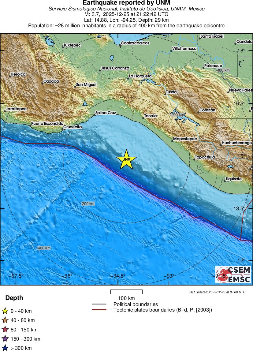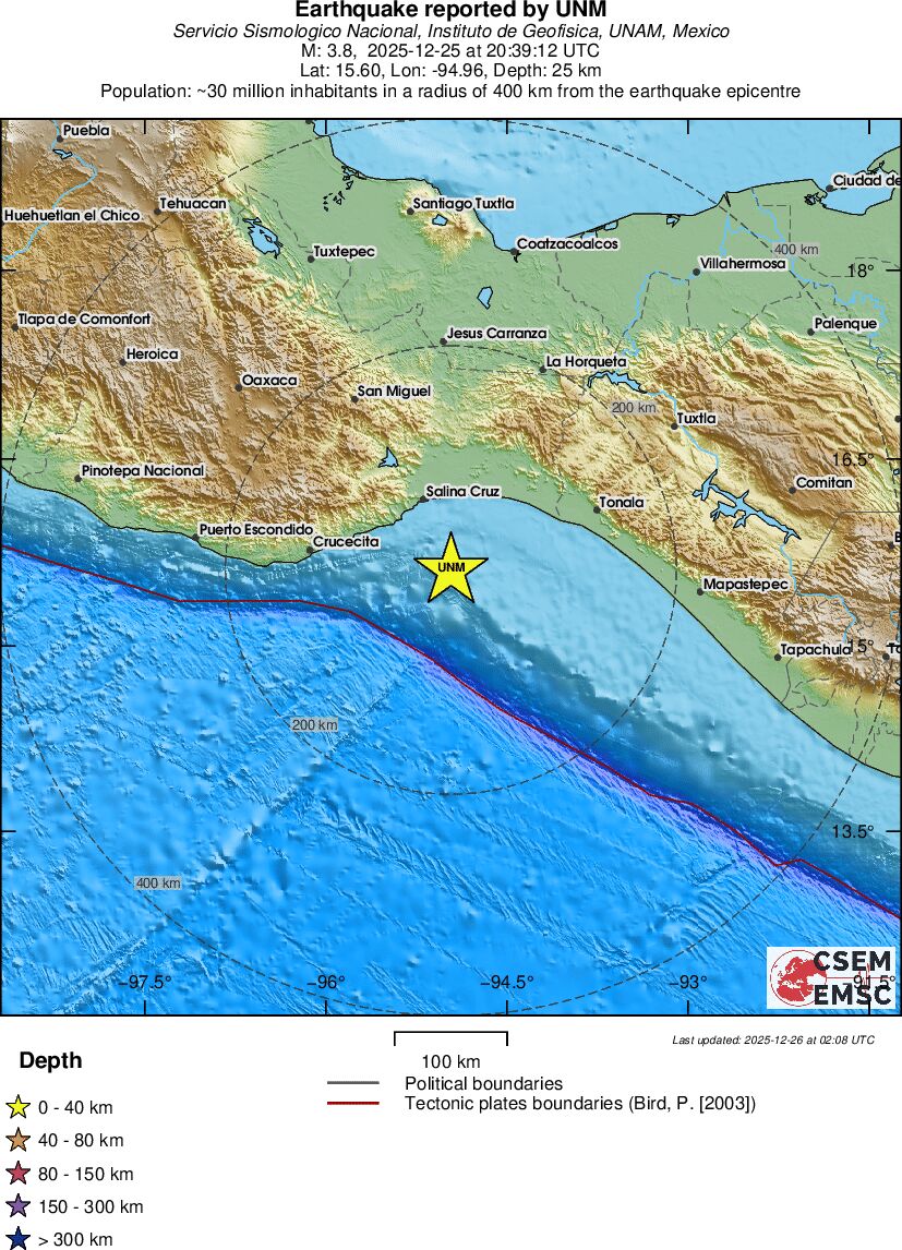 | 3.8 | 25 | 5397 | 20:39:12 | Link | Minor earthquake - OFFSHORE OAXACA, MEXICO - December 25, 2025 |