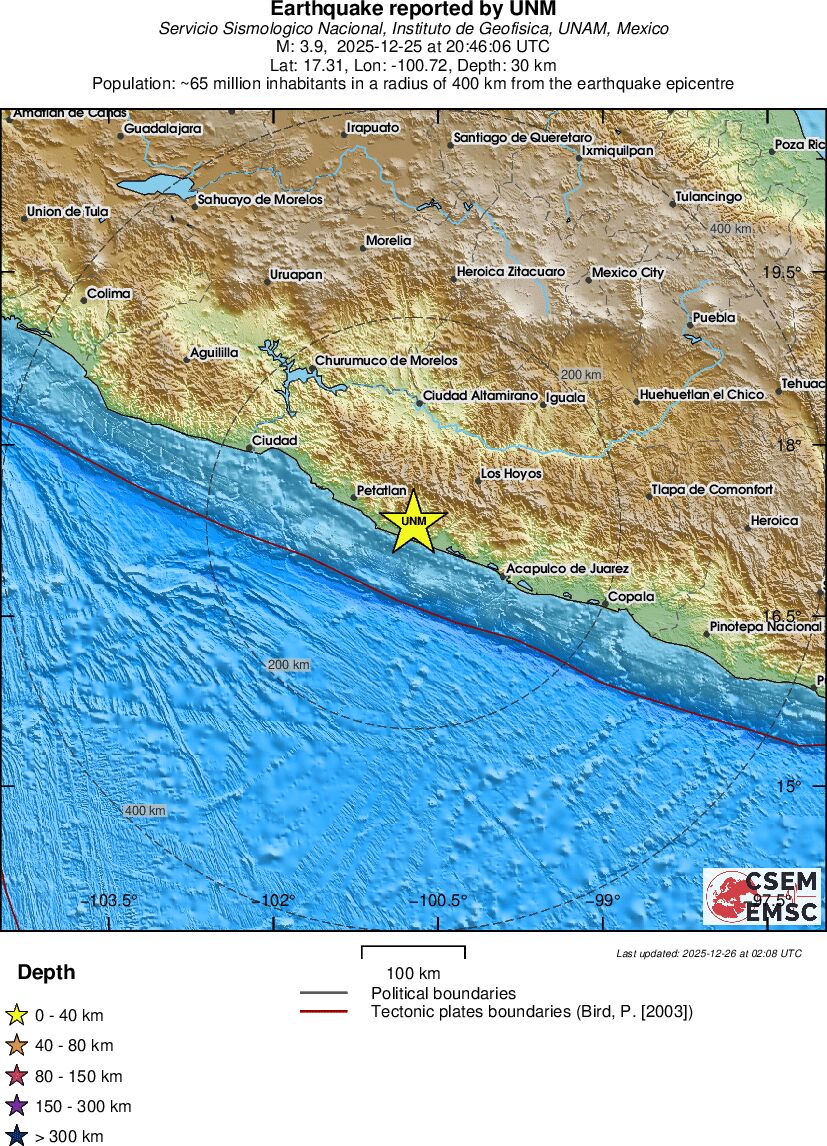 | 3.9 | 30 | 5517 | 20:46:06 | Link | Minor earthquake - GUERRERO, MEXICO - December 25, 2025 |