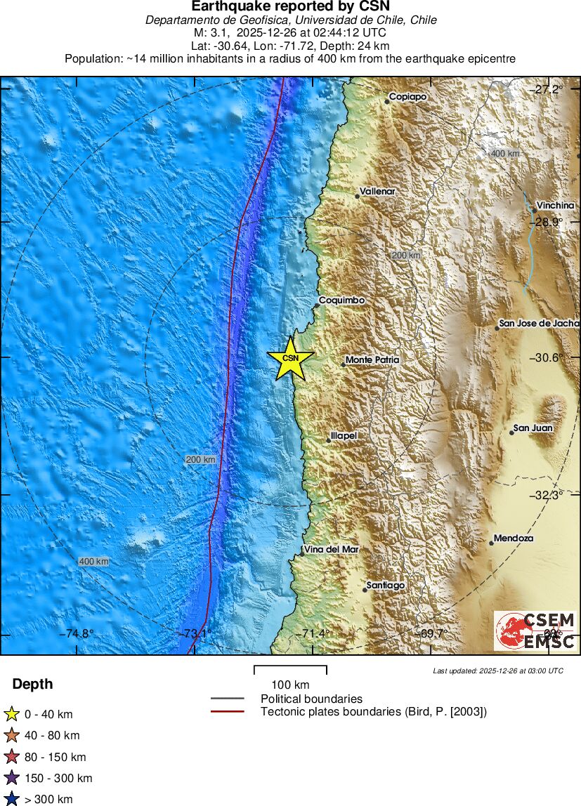 | 3.1 | 24 | 7200 | 02:44:12 | Link | Minor earthquake - OFFSHORE COQUIMBO, CHILE - December 26, 2025 |