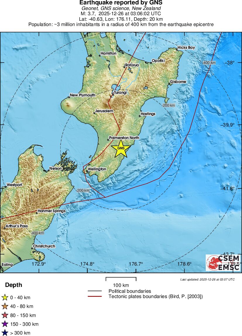 | 3.7 | 20 | 11382 | 03:06:02 | Link | Minor earthquake - NORTH ISLAND OF NEW ZEALAND - December 26, 2025 |