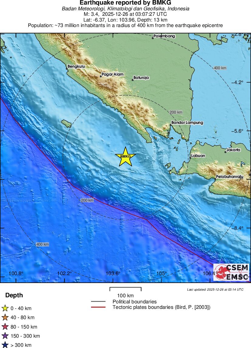 | 3.4 | 13 | 7245 | 03:07:27 | Link | Minor earthquake - SOUTHWEST OF SUMATRA, INDONESIA - December 26, 2025 |