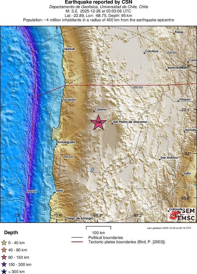 | 3.2 | 95 | 6647 | 03:03:06 | Link | Minor earthquake - ANTOFAGASTA, CHILE - December 26, 2025 |