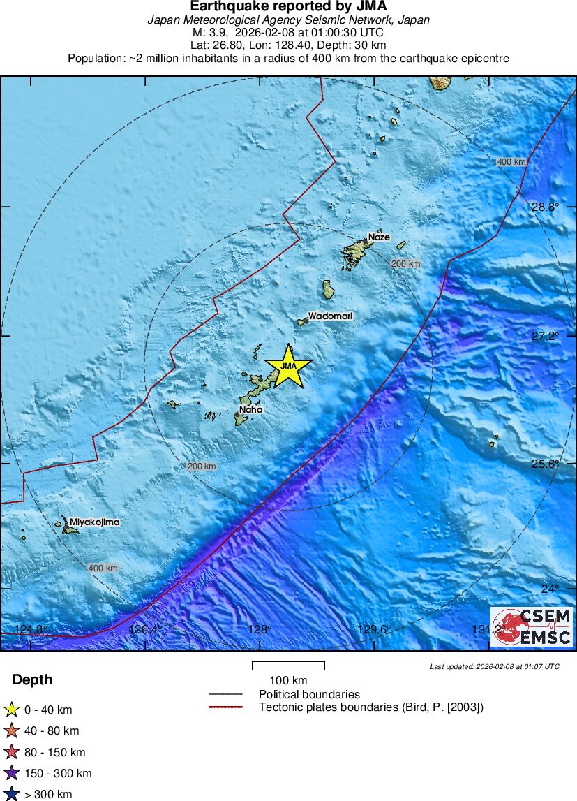| 3.9 | 30 | 6056 | 01:00:30 | Link | Minor earthquake - RYUKYU ISLANDS, JAPAN - February 8, 2026 |