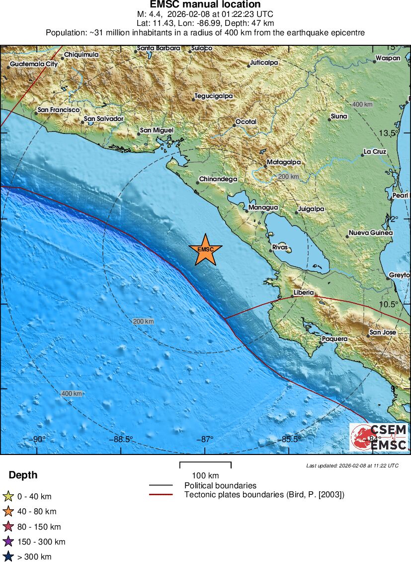 | 3.5 | 46 | 5342 | 01:22:20 | Link | Minor earthquake - NEAR COAST OF NICARAGUA - February 8, 2026 |