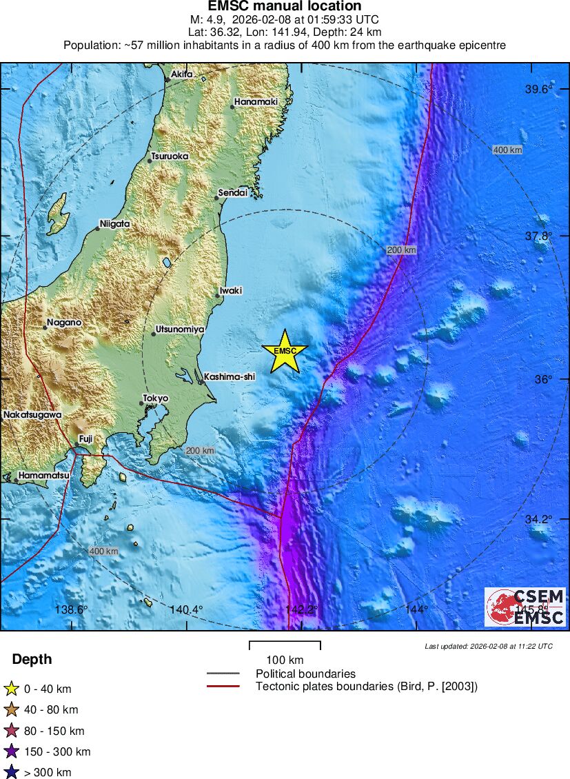 | 4.9 | 35 | 5738 | 01:59:35 | Link | Light earthquake - NEAR EAST COAST OF HONSHU, JAPAN - February 8, 2026 |