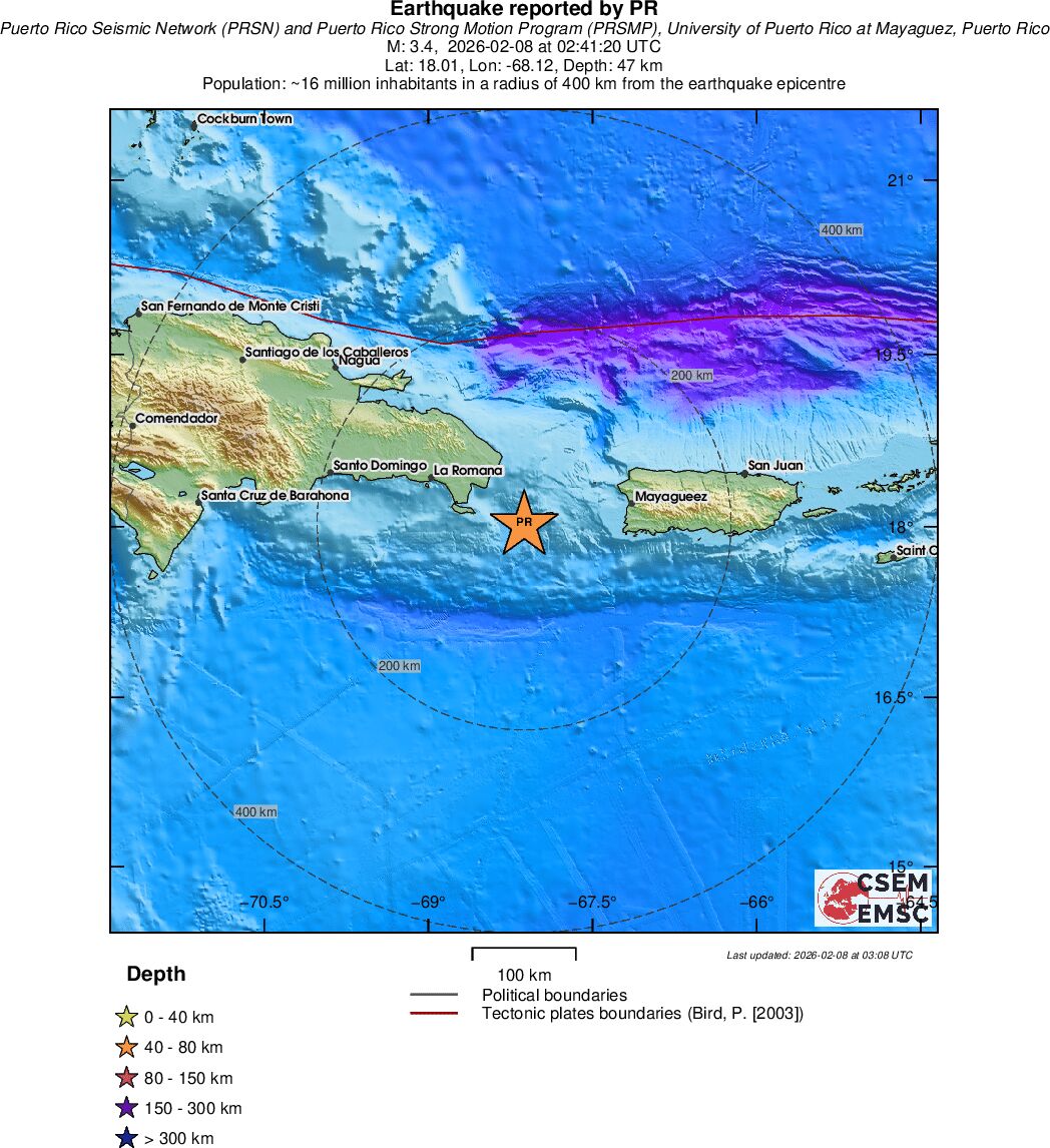 | 3.4 | 47 | 4227 | 02:41:20 | Link | Minor earthquake - DOMINICAN REPUBLIC REGION - February 8, 2026 |
