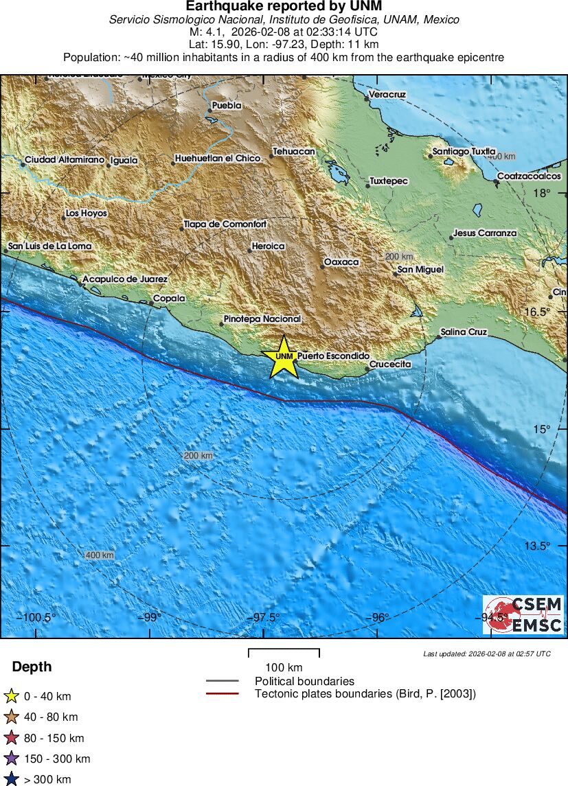 | 4.1 | 11 | 5466 | 02:33:14 | Link | Light earthquake - OFFSHORE OAXACA, MEXICO - February 8, 2026 |