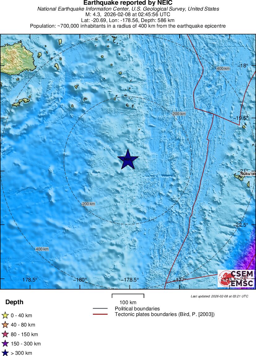 | 4.3 | 586 | 9992 | 02:45:56 | Link | Light earthquake - FIJI REGION - February 8, 2026 |
