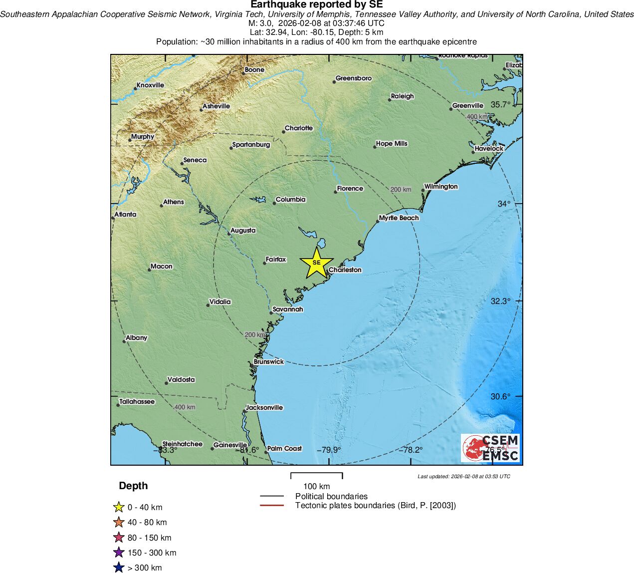 | 3.0 | 5 | 3882 | 03:37:46 | Link | Minor earthquake - SOUTH CAROLINA - February 8, 2026 |