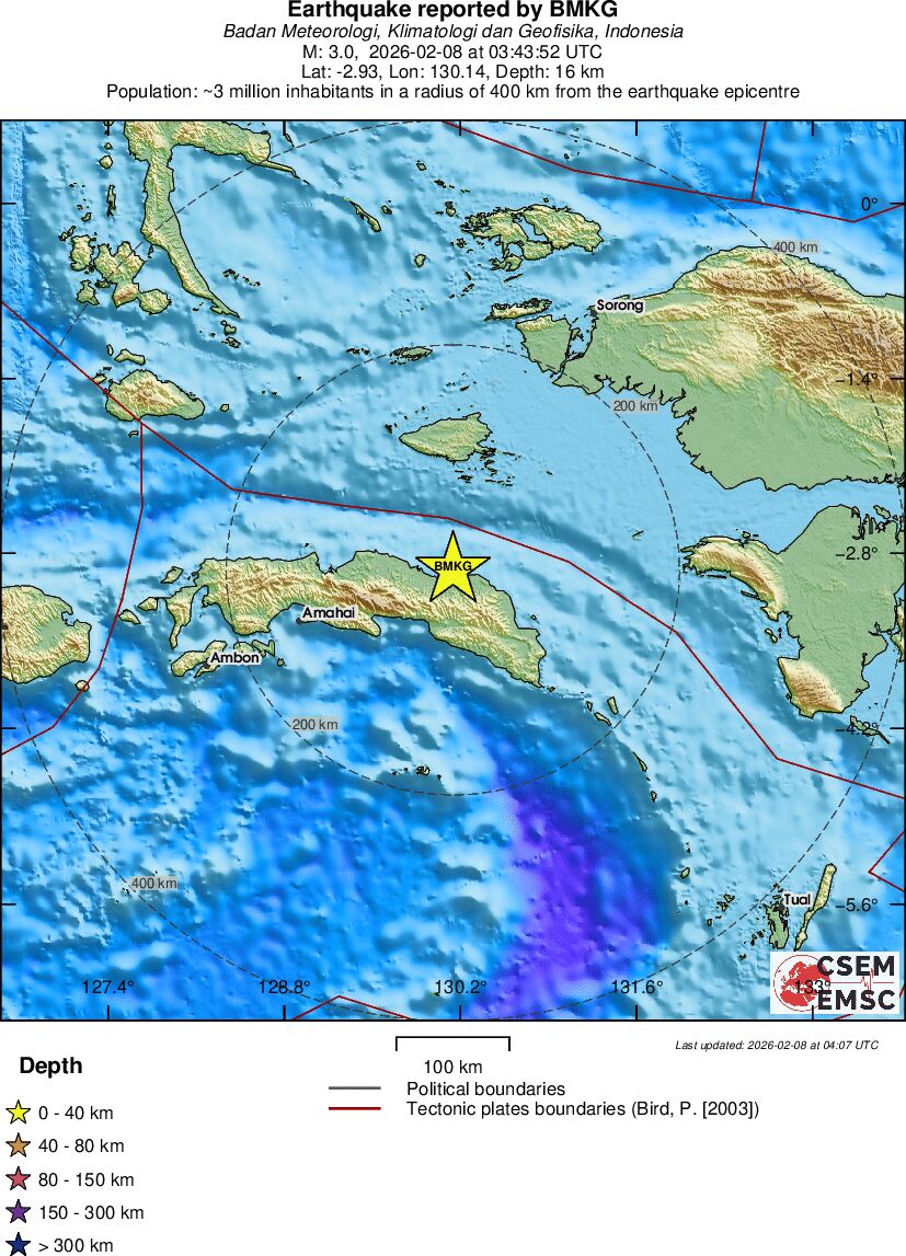 | 3.0 | 16 | 7963 | 03:43:52 | Link | Minor earthquake - CERAM SEA, INDONESIA - February 8, 2026 |