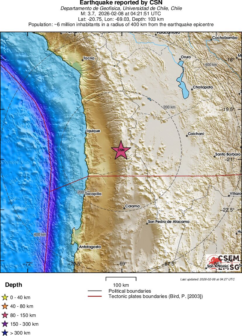 | 3.7 | 103 | 6530 | 04:21:51 | Link | Minor earthquake - TARAPACA, CHILE - February 8, 2026 |
