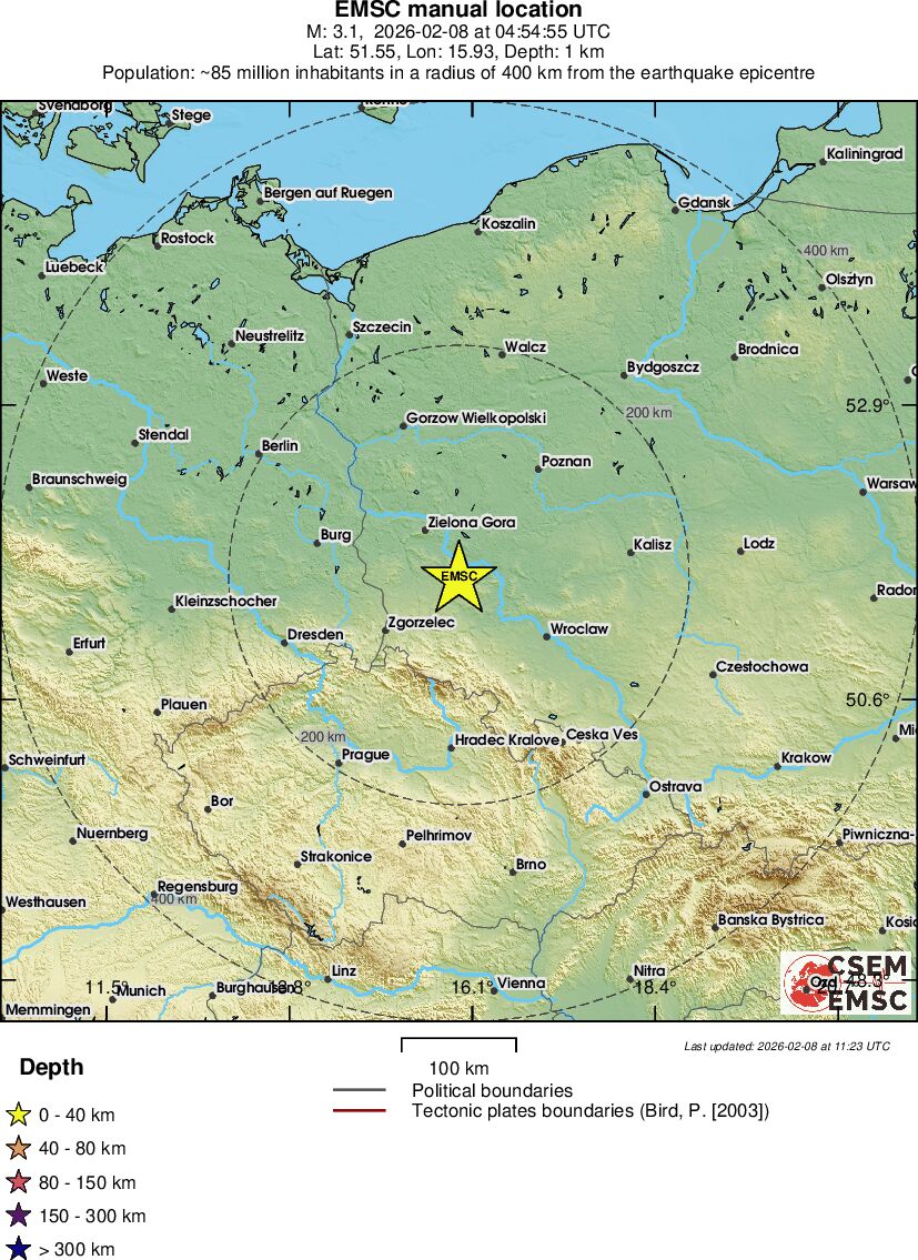 | 3.0 | 2 | 835 | 04:54:55 | Link | Minor earthquake - POLAND - February 8, 2026 |