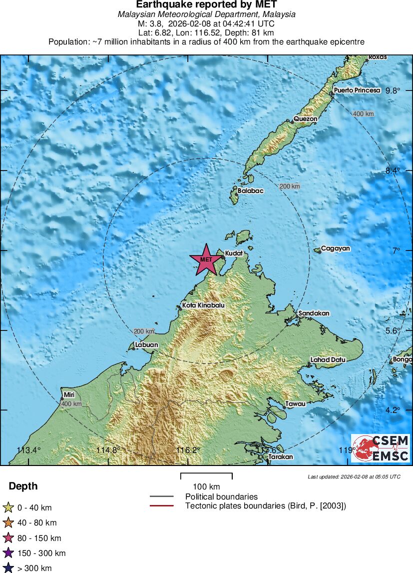 | 3.8 | 81 | 6926 | 04:42:41 | Link | Minor earthquake - SABAH, MALAYSIA - February 8, 2026 |
