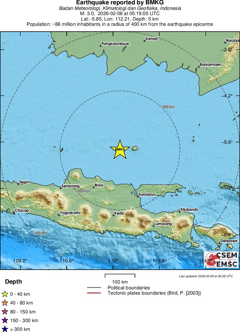 | 3.0 | 5 | 7524 | 05:19:05 | Link | Minor earthquake - JAVA SEA - February 8, 2026 |