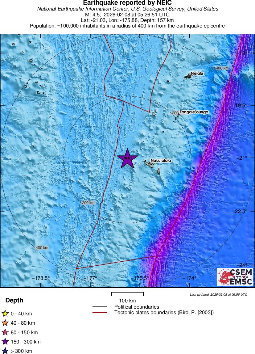 | 4.5 | 157 | 9998 | 05:26:51 | Link | Light earthquake - TONGA - February 8, 2026 |
