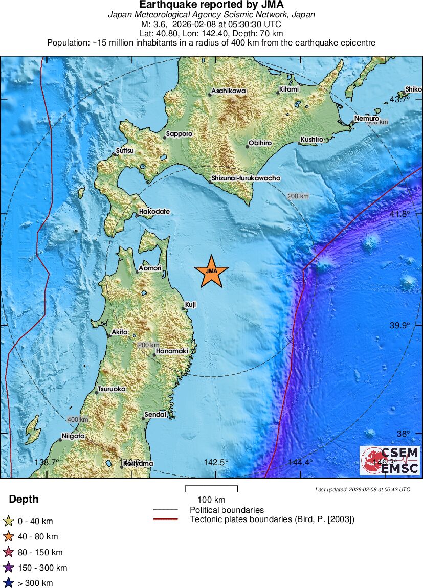 | 3.6 | 70 | 5458 | 05:30:30 | Link | Minor earthquake - NEAR EAST COAST OF HONSHU, JAPAN - February 8, 2026 |