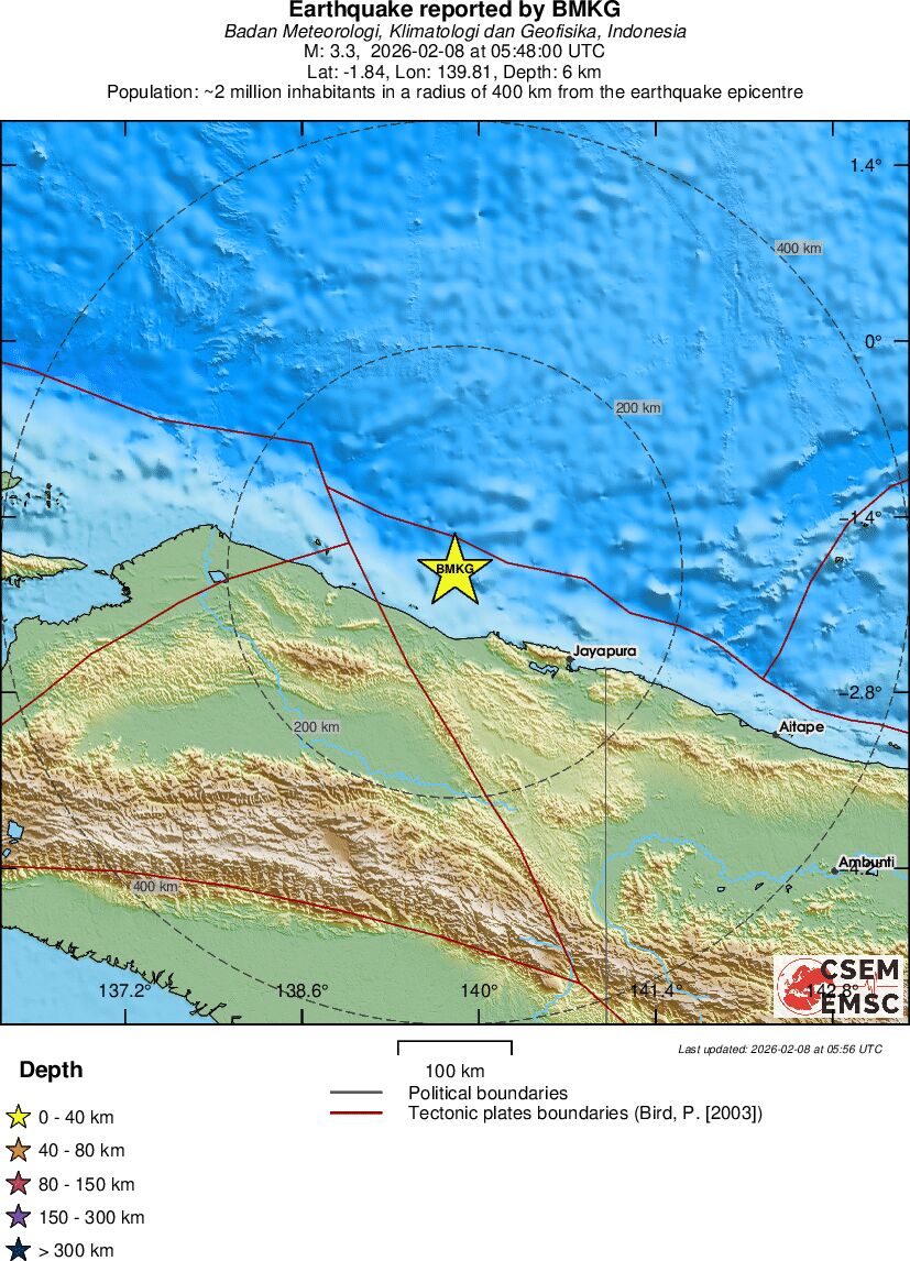 | 3.3 | 6 | 8174 | 05:48:00 | Link | Minor earthquake - NEAR N COAST OF PAPUA, INDONESIA - February 8, 2026 |