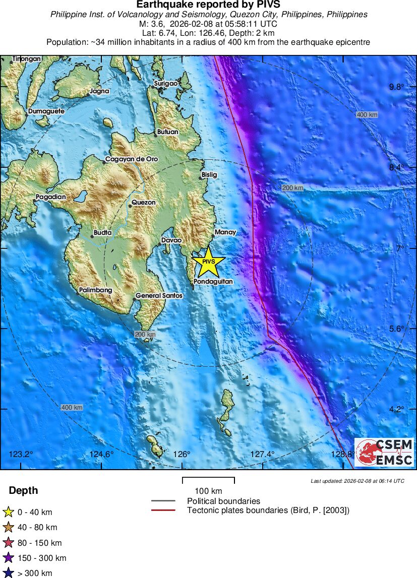 | 3.6 | 2 | 7253 | 05:58:11 | Link | Minor earthquake - MINDANAO, PHILIPPINES - February 8, 2026 |