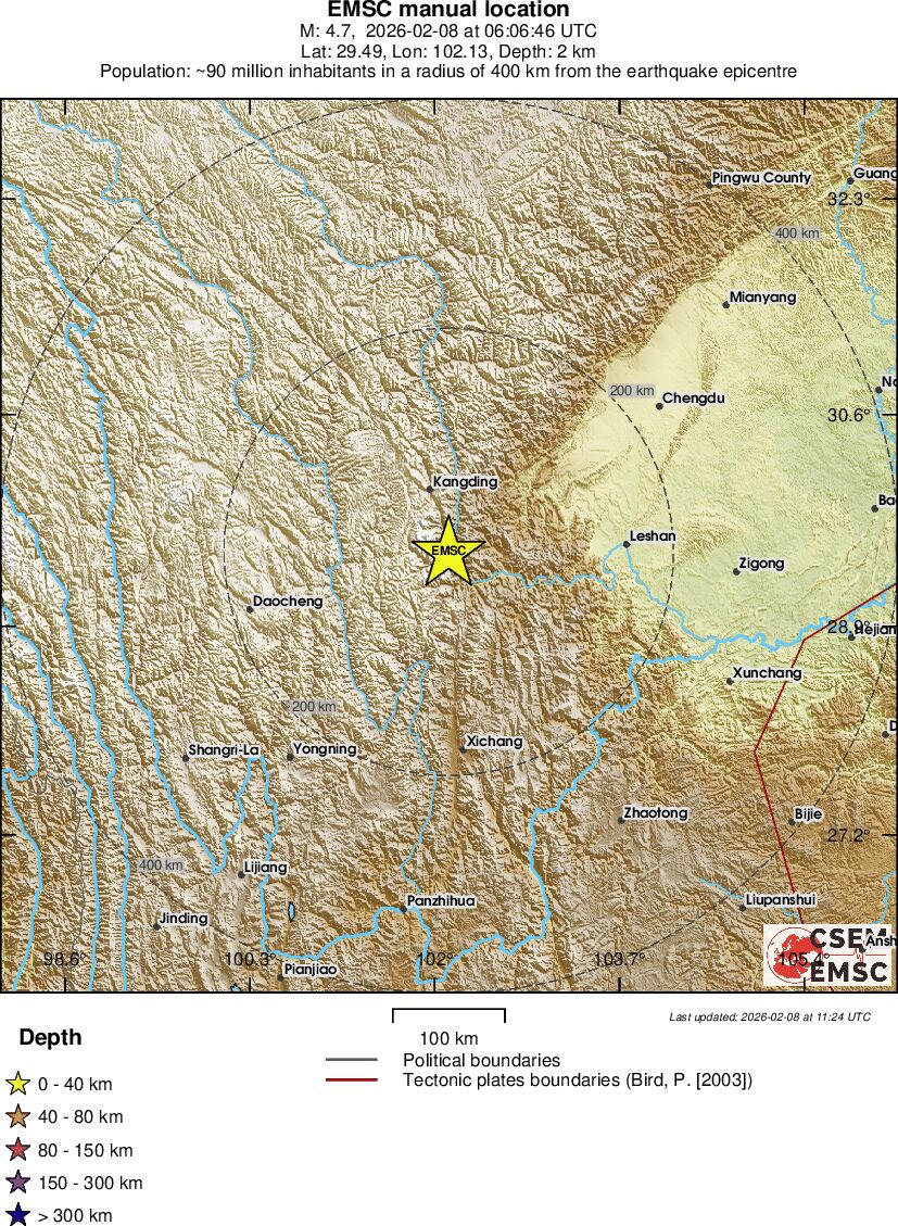 | 4.7 | 10 | 5100 | 06:06:48 | Link | Light earthquake - WESTERN SICHUAN, CHINA - February 8, 2026 |